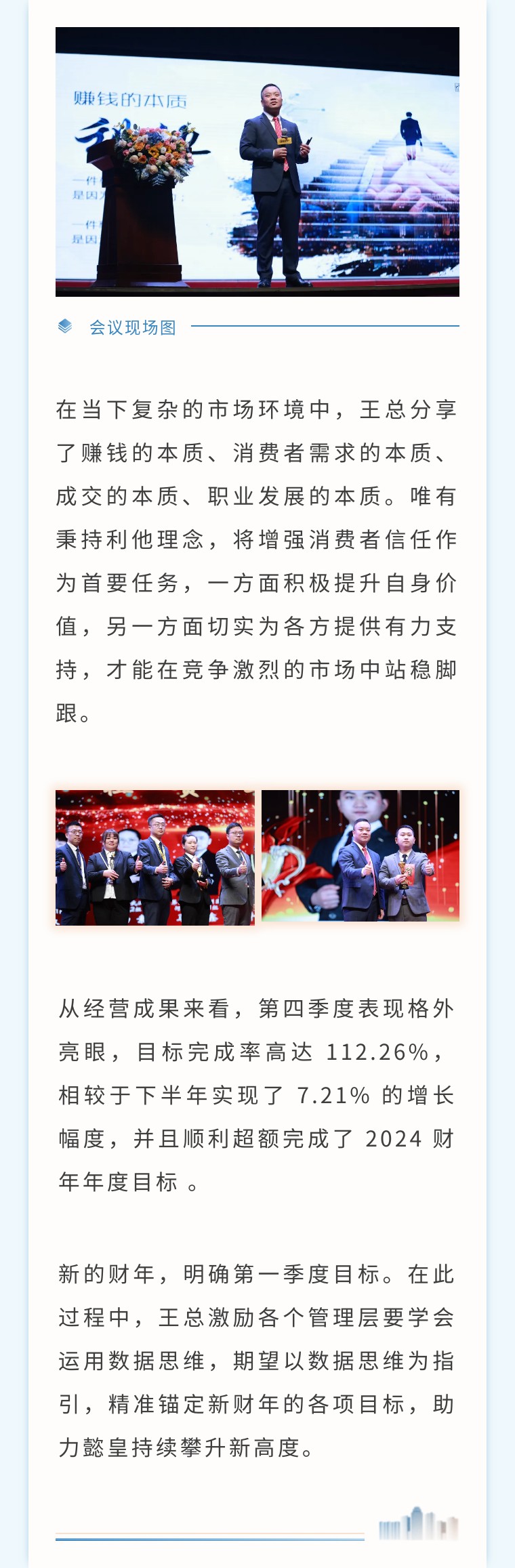 回首第四季度,我們以無畏之姿,披荊斬棘,斬獲了一項項斐然成就,那是全體同仁汗水與智慧的結(jié)晶。如今,第一季度大會的集結(jié)號已然吹響,讓我們懷揣熱血與豪情,奔赴這場盛會,攜手在新季度中踏浪前行,再創(chuàng)輝煌,向著更高峰奮勇攀登,鐫刻屬于我們的璀璨榮耀!